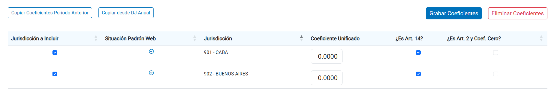 En caso de que el contribuyente no posea coeficientes de distribución (por estar dentro del primer año del Régimen General del art. 2, por tener una nueva jurisdicción), debe tildar la opción "Artículo 14" y colocar el valor 0 (cero) en las jurisdicciones que correspondan. Para finalizar, grabe los coeficientes y proceda a armar la DJ.